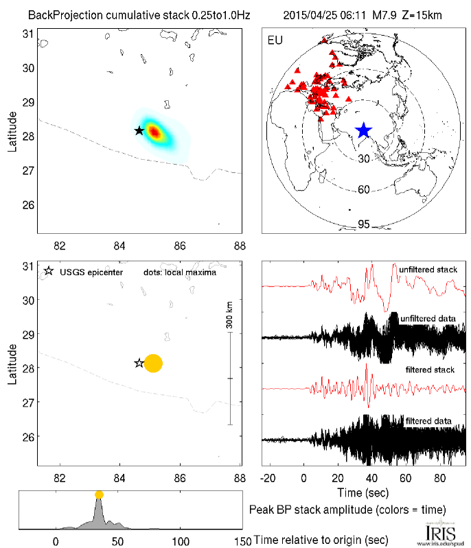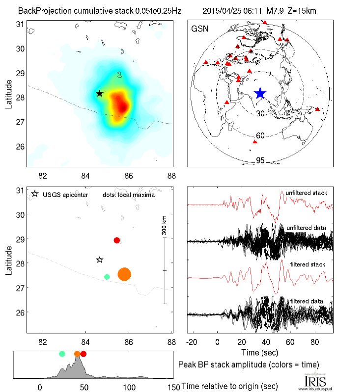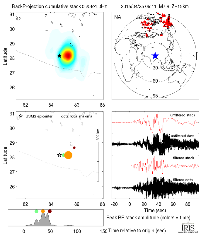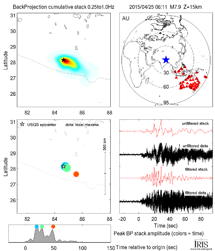 The Back Projection (BP) product shows the beamformed time history and location of coherent short period P-wave energy generated by large earthquakes observed at three regional arrays and across the Global Seismic Network. These are automatically generated following all global M6.5+ earthquakes. Virtual networks are formed by choosing stations within 25 degrees distance or azimuth to the center of three continents (NAmerica, EUrope, AUstralia). All available BHZ data are then aligned using a Multi-Channel Cross Correlation scheme which also downsamples the network by only choosing the stations with the highest average cross-correlation coefficient and at least one degree distance to it's nearest neighboring stations. BPs are performed by beam forming energy using square-root stacking to a flat grid around the source region with variable spatial resolution scaled by the magnitude of the earthquake. A 5 s wide cosine taper is used to average the beams. BP results are then averaged over time windows whose length increases with magnitude. The upper gallery shows a movie of the combined BPs from all networks with sufficient data. The array response function is also shown which is generated using the same processing techniques and stations, except the raw data are replaced with synthetic seismograms with 5 s wide point-source triangle functions. The first and last frames show cumulative time integrated results. Results are affected by radiation pattern, Greens functions variations and array geometry. Warmer colors indicate greater beam power. A small cross shows the location of the peak beam power when absolute beam powers are low. The lower gallery shows a summary figure for each array's BP as well as the individual array movie. In the summary figure, the lower left panel shows the time and location of local maxima. The colors correspond to relative time and the diameter to relative beam power. The other panels show the time-integrated results, the source-receiver geometry, and the MCCC aligned traces. At the bottom of the page, text files with peak beam power (and their Lat/Lon location) as a function of time relative to origin are given for both the data and the synthetic ARF. For more information on Back Projections visit the Backprojection product page. |