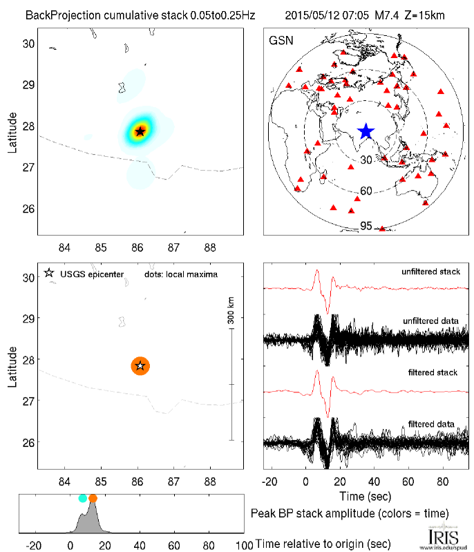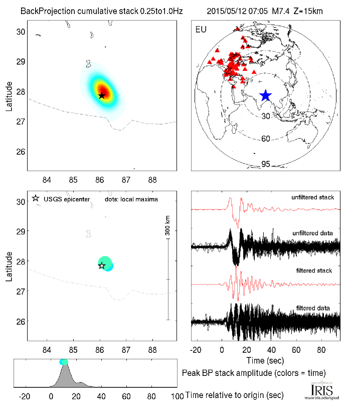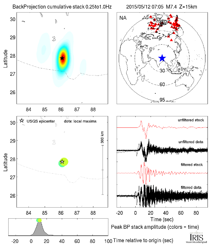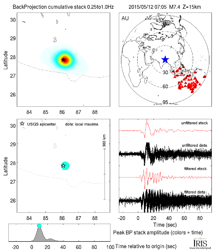 The Back Projection (BP) product shows the beamformed time history and location of coherent short period P-wave energy generated by large earthquakes observed at three regional arrays and across the Global Seismic Network. These are automatically generated following all global M6.5+ earthquakes.